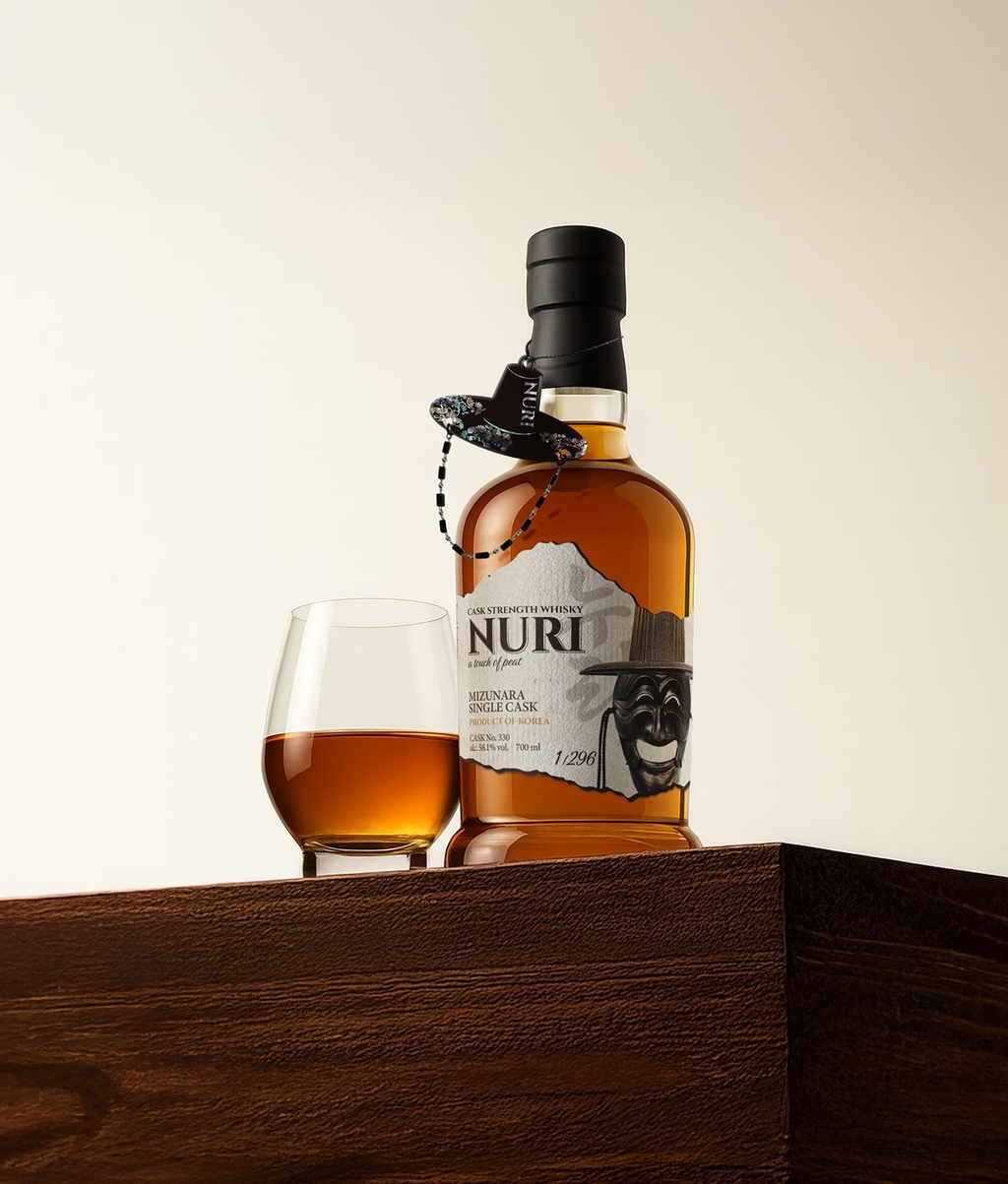 ‘누리(NURI)’는 프랑스·일본·한국, 세 나라의 위스키 기술과 환경을 결합해 탄생한 K-위스키 브랜드다. 프랑스 전통 증류소에서 생산한 싱글 몰트 원액을 한국으로 들여와 일본산 미즈나라 오크 캐스크에서 숙성과 병입을 진행했으며, 한국의 기후와 숙성 환경을 거쳐 누리만의 개성을 완성했다.