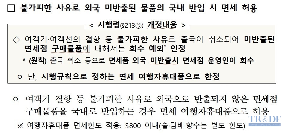 세제 개편안 후속 시행규칙 개정에서 불가피한 사유로 외국에 미반출된 물품의 국내 재 반입시 면세가 허용될 예정이다. 재정경제부는 27일 11시 30분 2025년 세제개편 후속 시행규칙 개정 추진을 발표하면서 그동안 폭설이나 기타 불가피한 상황으로 항공편이나 여객선이 결항 될 경우 해외 여행을 위해 출국 수속 등을 거친 여객들이 구입한 면세품을 다시 반품 하거나 취소된 항공편이 재확정 될 때까지 보관하는 등 많은 부분이 불편한 부분을 수정 발표했다.