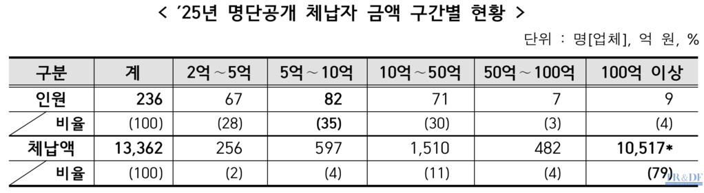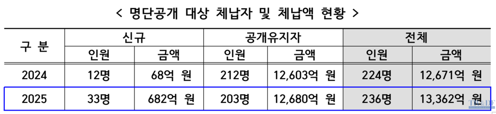 - 개인·법인 합해 25년 총 236명, 체납액 1조 3,362억 원 공개