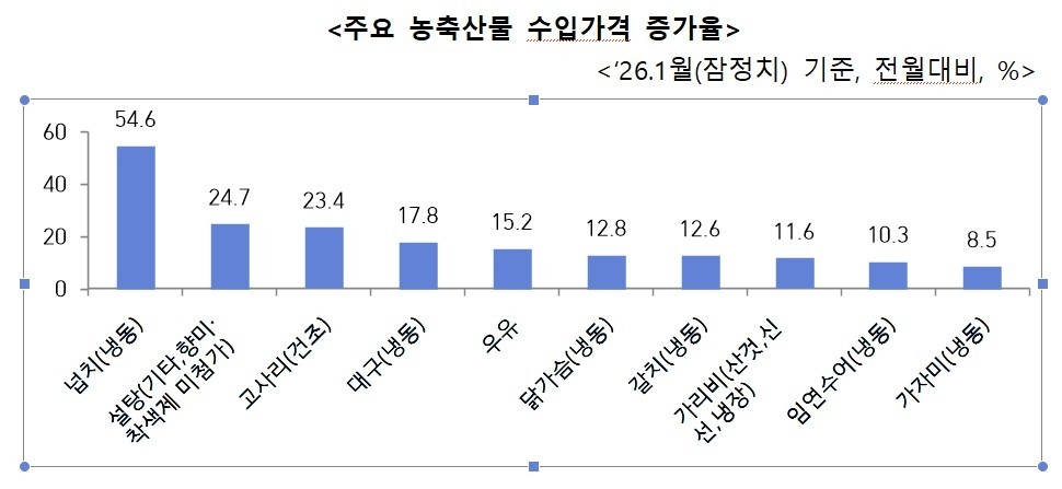 관세청 통관국 통관기획과 양승혁 과장은 “관세청 수입가격 공개 자료(2026년 1월 잠정치 기준)에 따르면, 전월 대비 냉동넙치 54.6%, 설탕 24.7%, 건조 고사리 23.4% 등 먹거리 수입 물품의 가격이 큰 폭으로 상승했다”며 “식품 원재료의 수입의존도가 높은 우리나라의 경우 수입 먹거리 가격 상승이 장바구니 물가의 상승으로 직결되는 만큼, 수입 단계에서 가격 상승 요인을 차단할 필요가 크다”고 지적했다.