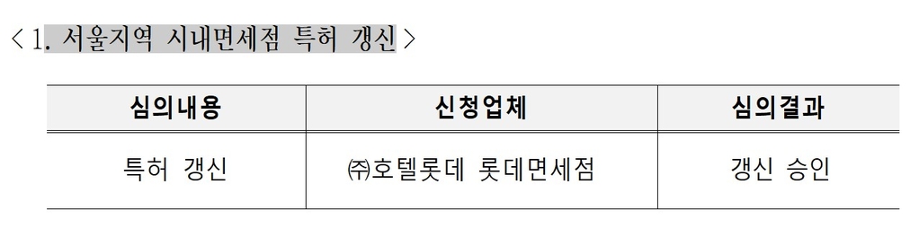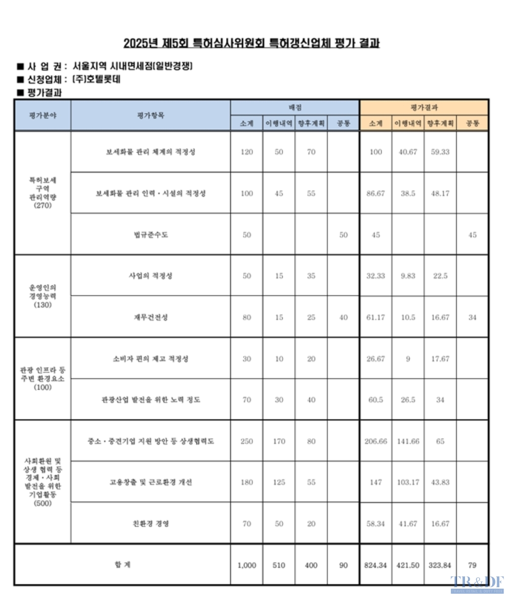 특허심사위원회가 공개한 점수표를 보면 롯데면세점은 모든 항목에서 고르게 점수를 획득해 안정적인 갱신 승인 점수를 획득한 것으로 보인다.